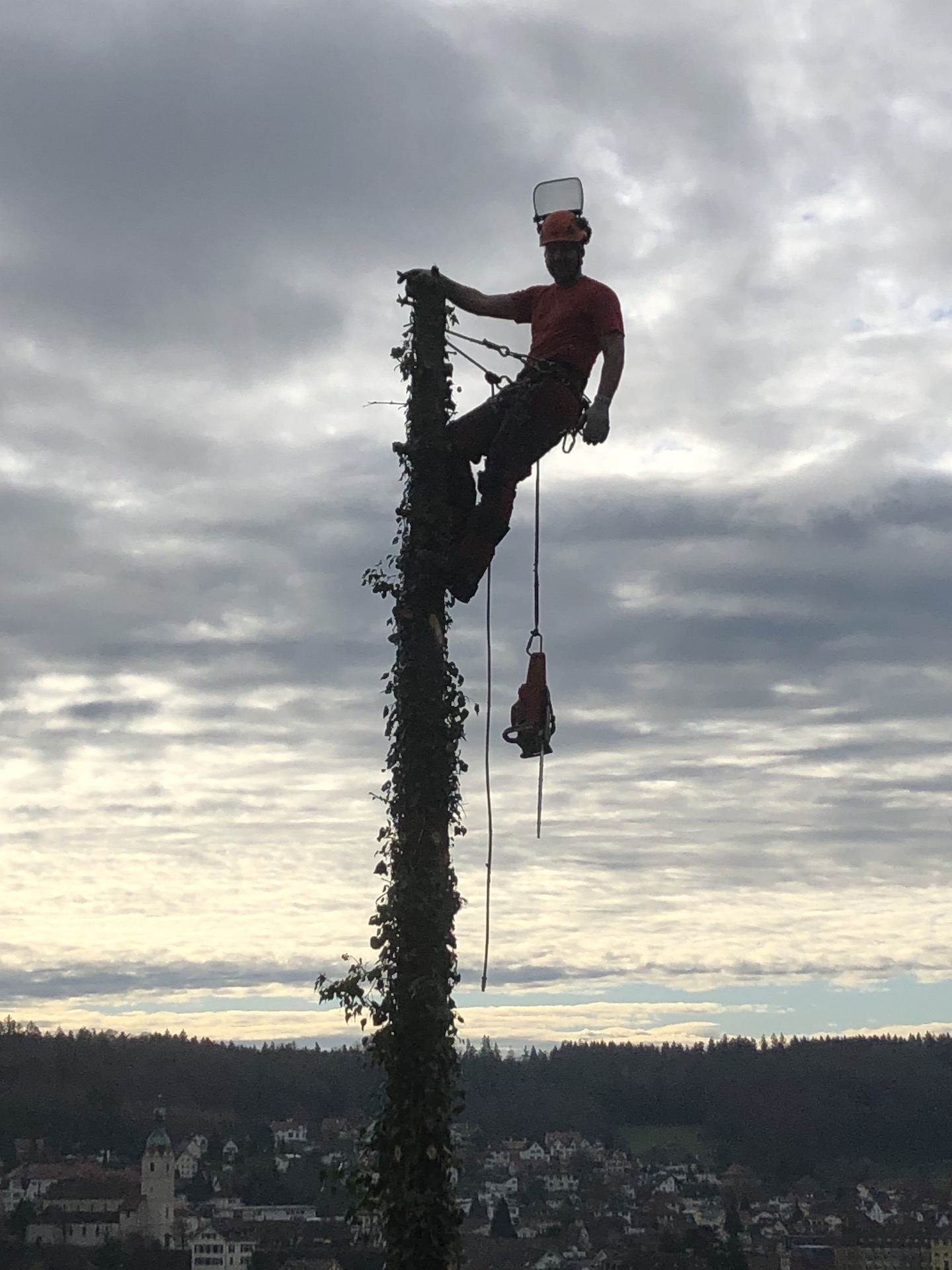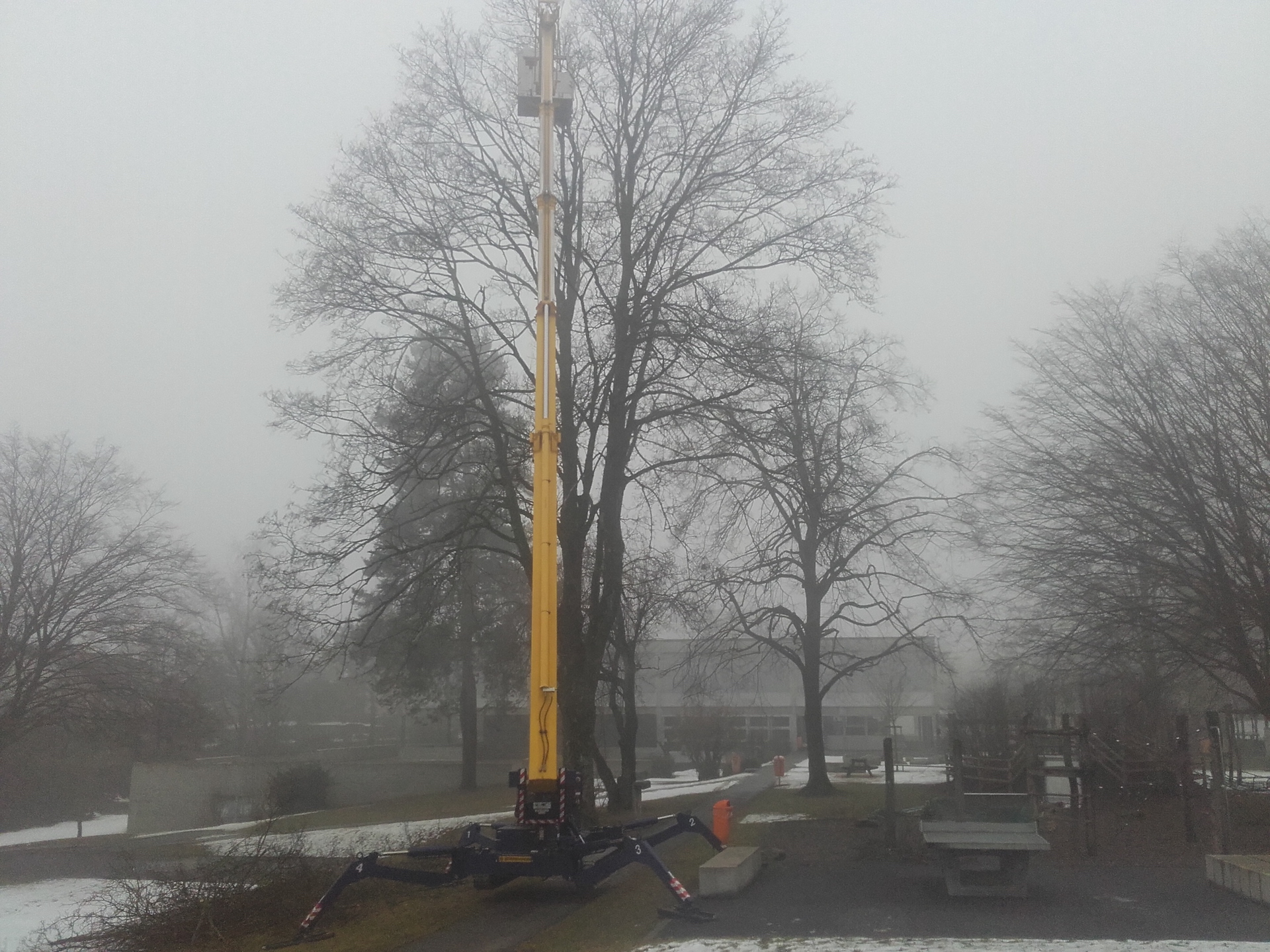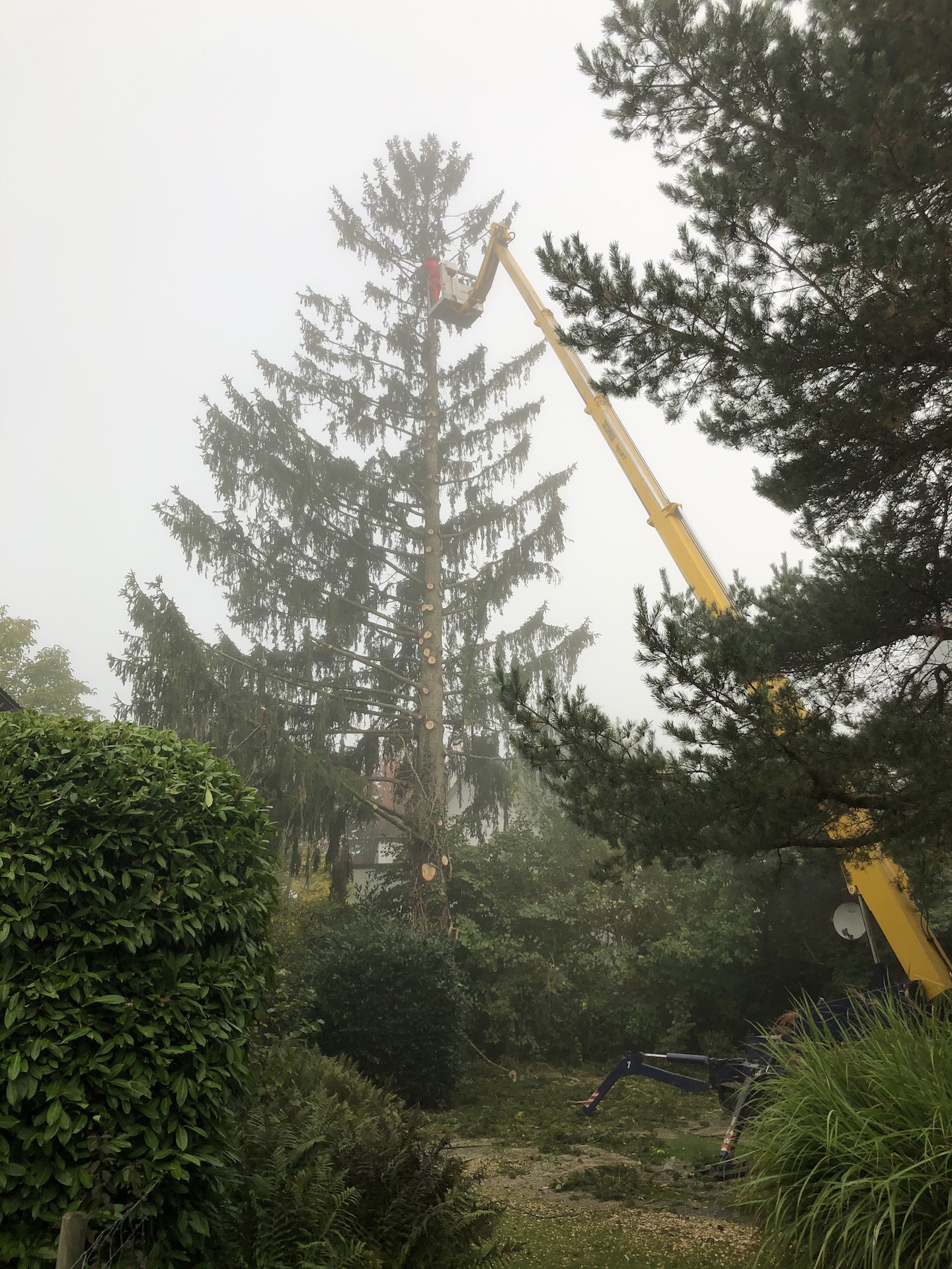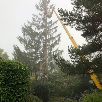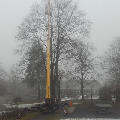 Wir fällen oder schneiden auch Bäume mit der Hebebühne, diese kann bodenschonend in kleinen Gärten platziert werden.